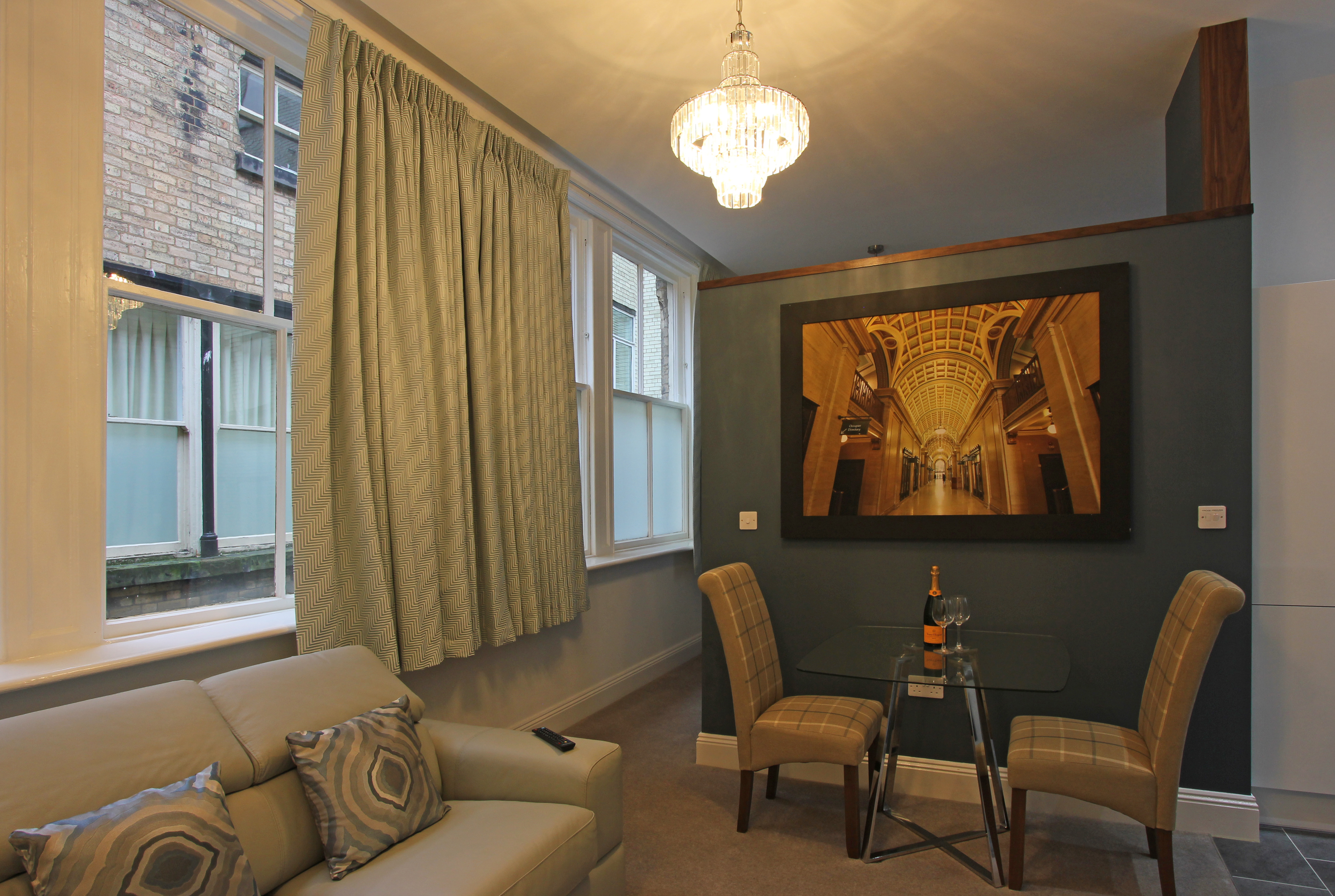 Luxury one bedroom fully furnished Serviced Apartment offers open-plan Living/Dining area with flat-screen TV, luxury Italian leather sofas and stylish dining furniture. Fully equipped kitchen with cooker, hob, microwave, kettle and toaster, integrated fridge/freezer and washer/dryer are also featured within the bright contemporary kitchens.